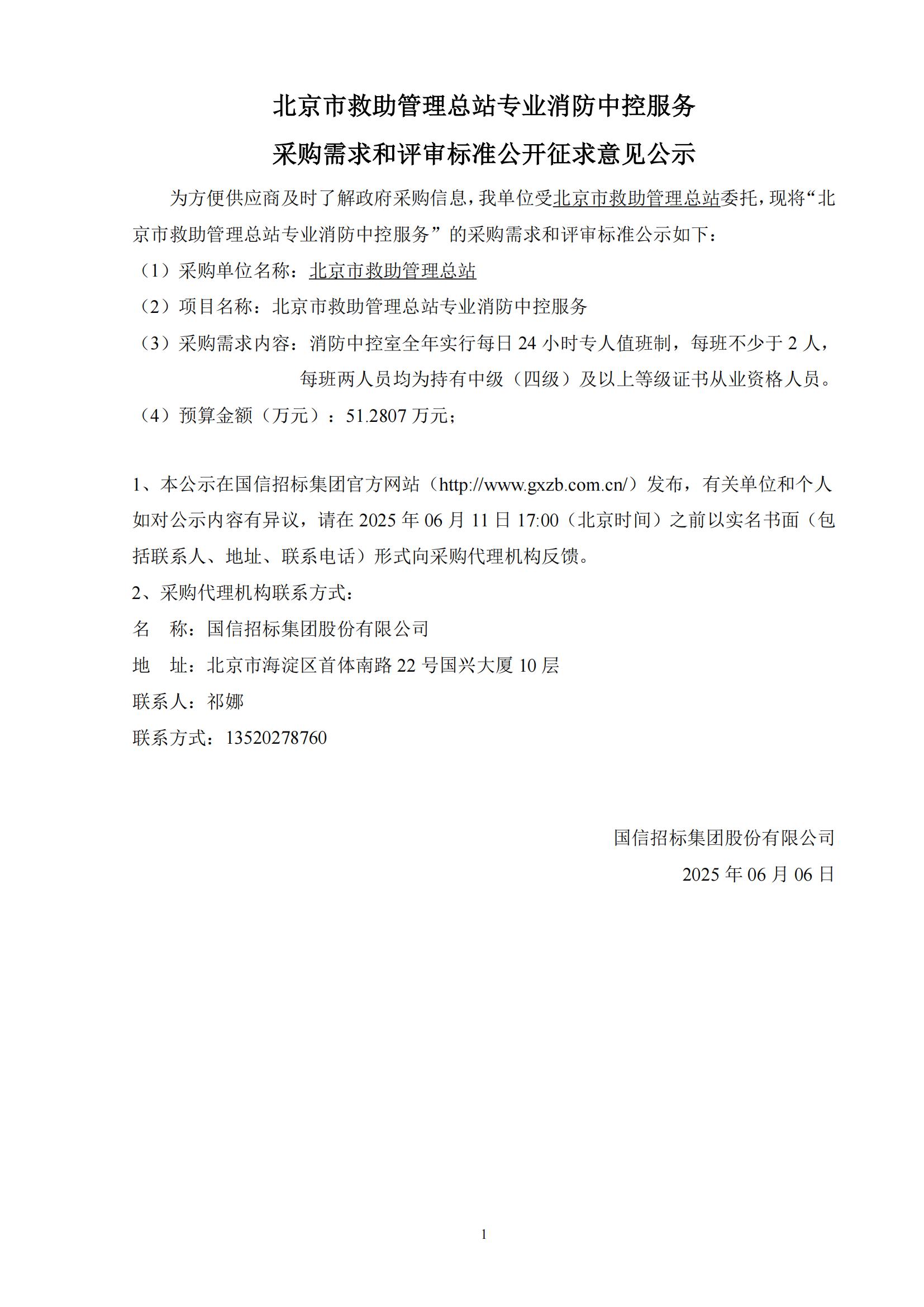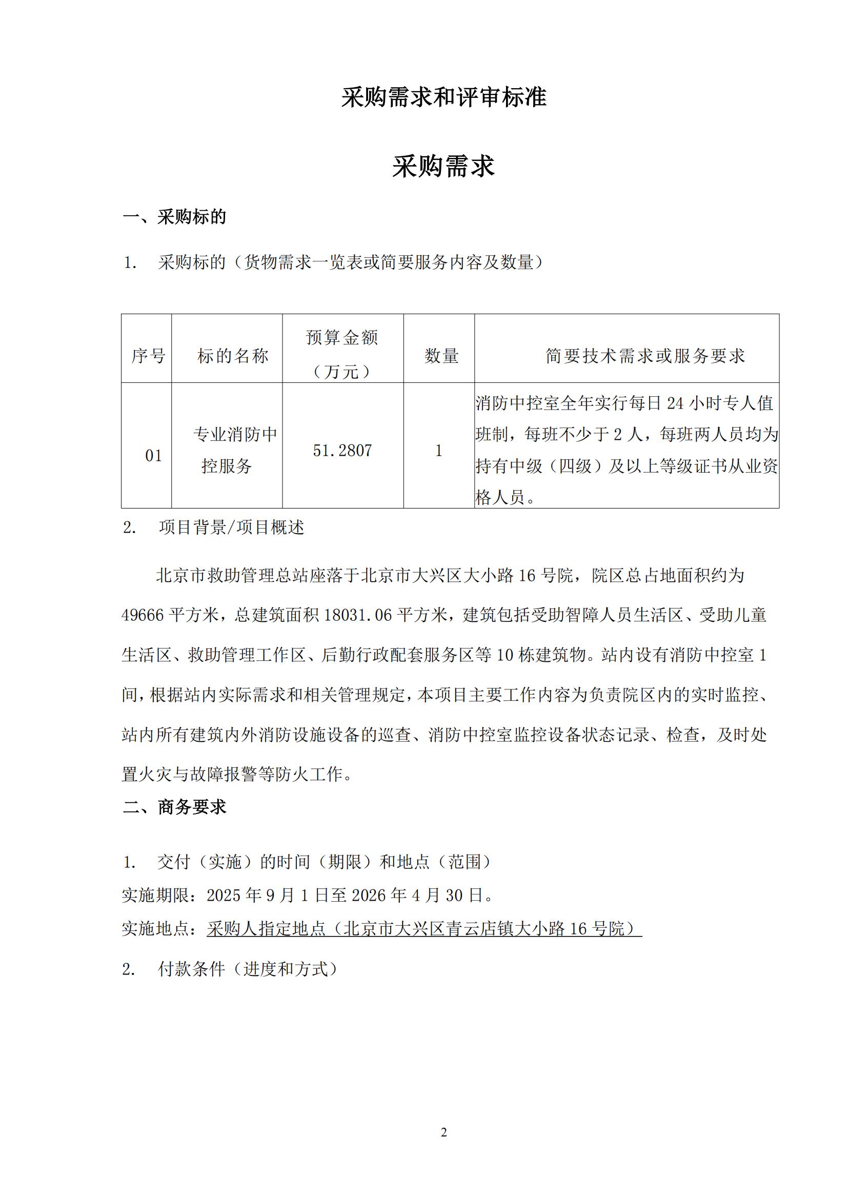采購需求和評審標準公示版——北京市救助管理總站專業(yè)消防中控服務06.06發(fā)布